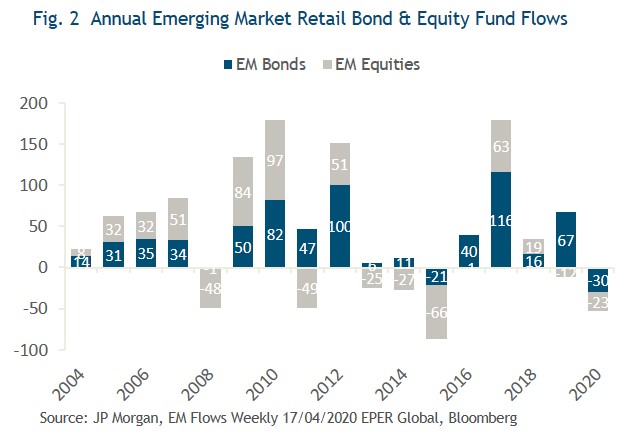 Outflows from EM fixed income assets have reached $30.5bn YTD (Fig.2)--similar to what the asset class experienced during the selloffs in both the 2013 –“Taper Tantrum” and the 2015 “Commodity Crisis”. We believe it is fair to say that “EM tourist” investors (defined as those investors who will leave the market at the first sign of volatility) have sold out at this point. Starting in April, the speed of outflows has significantly slowed down (Fig.3) and even turned positive with inflows.