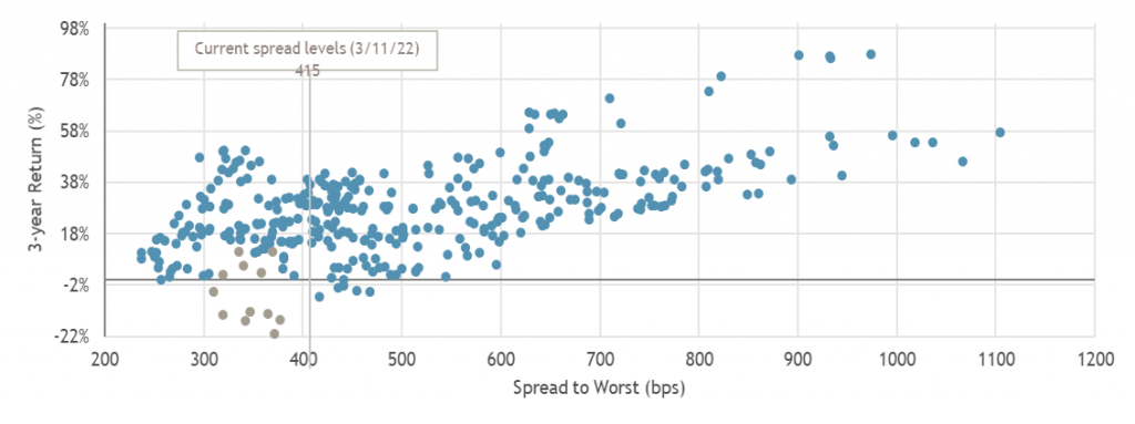 Source: Muzinich analysis. Data as of March 11, 2022. For illustrative purposes only. Date range of data is September 30, 1988, to March 11, 2022. Returns are the cumulative 3-year returns for the ICE BofA ML US HY Cash Pay Index (J0A0). Spread-to-Worst of J0A0 index. Gray dots represent the period 7/31/2005 – 6/30/2006, leading up to the Great Financial Crisis. Strategies can lose money and will be impacted by market conditions