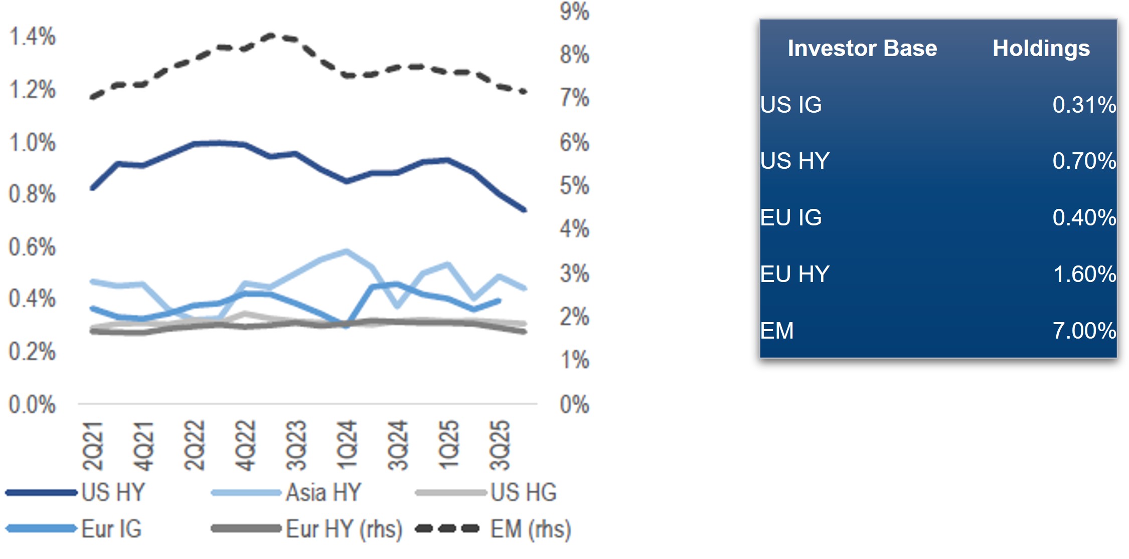 Our core thesis is that global asset allocators remain meaningfully underweight EM fixed income. This view is underpinned by persistent outflows from the asset class between 2022 and mid-2025, a stark contrast to developed market credit, which attracted sustained inflows from 2023 onwards.14 A notable consequence of this dynamic is that ownership has migrated toward stickier domestic investors. New issue allocations to Middle Eastern domestic accounts rose from 39% to 55% in 2024, reflecting a structural shift in the buyer base.13