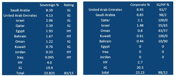 For ETF and benchmark-oriented strategies, we reference the ICE BofA indexes, which may diverge from the JP Morgan index suite. Within this framework, Saudi Arabia and UAE represent the two largest sovereign and corporate index weights, each exceeding 8% (Figure 3). Both are A-rated sovereigns with minimal high yield corporate exposure. Within the sovereign index, the most meaningful high yield exposure is Egypt at 1.9%, while in the corporate index, Israel high yield accounts for approximately 1%.