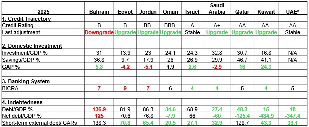 Finally, we assess sovereign indebtedness; debt above 100% is treated as unsustainable, although there is no universally agreed threshold, and liquidity needs through the ratio of external funding over the next 12 months relative to current account receipts. A ratio of 100 -150% is considered adequate, although it signals refinancing risk. A ratio above 150% is considered weak, indicative of significant rollover dependency and heightened vulnerability to a sudden loss of market access.