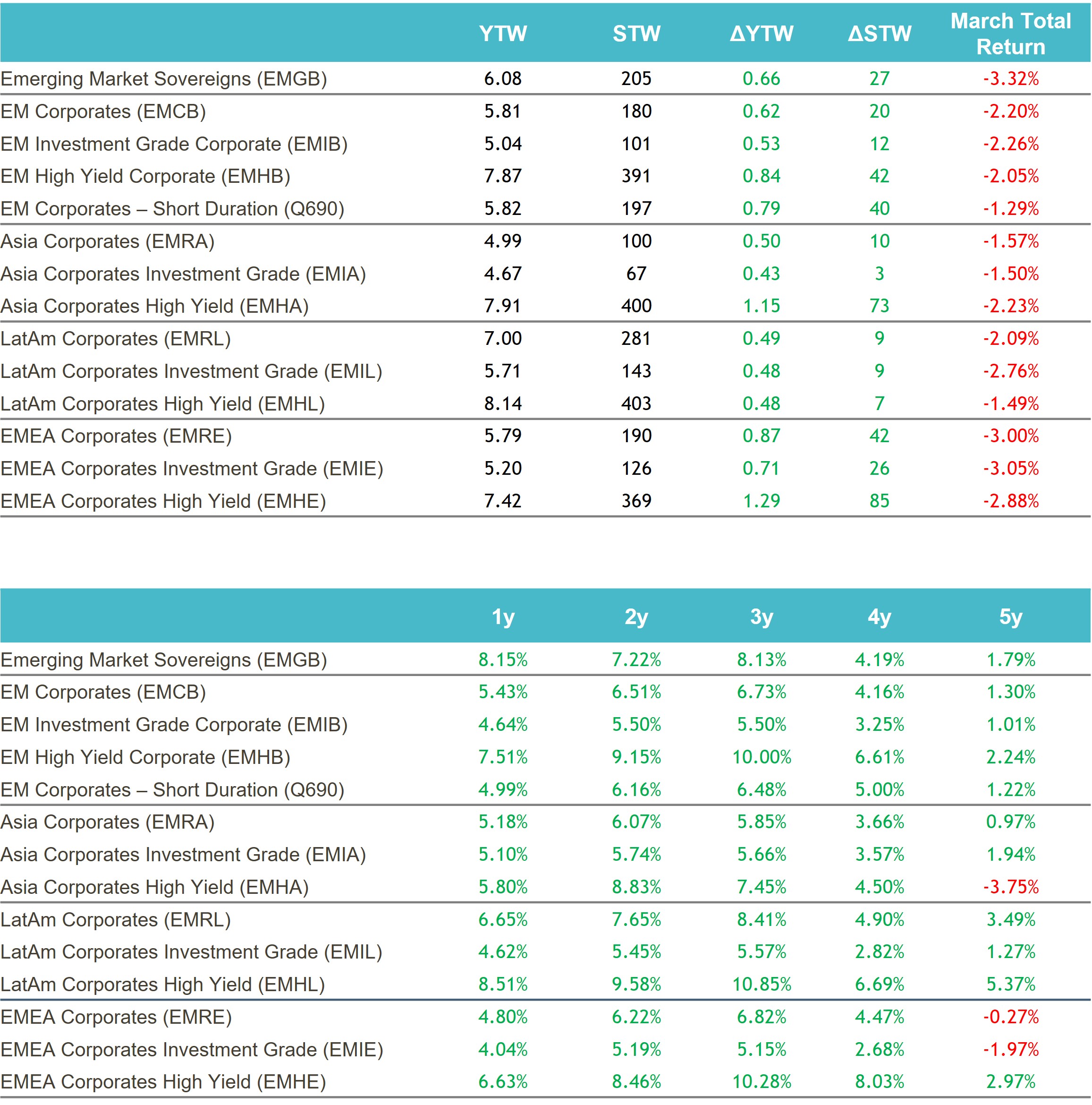 Source: ICE data platform. as of 31st March 2026. EMGB - ICE BofA Emerging Markets External Sovereign Index EMCB - ICE BofA Emerging Markets Corporate Plus Index, EMIB - ICE BofA High Grade Emerging Markets Corporate Plus Index, EMHB - ICE BofA High Yield Emerging Markets Corporate Plus Index, Q690 - ICE BofA Custom Emerging Markets Short Duration Index, EMRA - ICE BofA Asia Emerging Markets Corporate Plus Index, EMIA - ICE BofA High Grade Asia Emerging Markets Corporate Plus Index, EMHA - ICE BofA High Yield Asia Emerging Markets Corporate Plus Index , EMRL - ICE BofA Latin America Emerging Markets Corporate Plus Index, EMIL - The ICE BofA High Grade Latin America Emerging Markets Corporate Index, EMHL - ICE BofA High Yield Latin America Emerging Markets Corporate Plus, EMRE - ICE BofA EMEA Emerging Markets Corporate Plus Index, EMIE - ICE BofA High Grade EMEA Emerging Markets Corporate Plus Index, EMHE - ICE BofA High Yield EMEA Emerging Markets Corporate Plus Index,. Index performance is for illustrative purposes only. You cannot invest directly in the index. Indices selected provide best proxy for highlighting performance of emerging market corporate bonds. For illustrative purposes only.