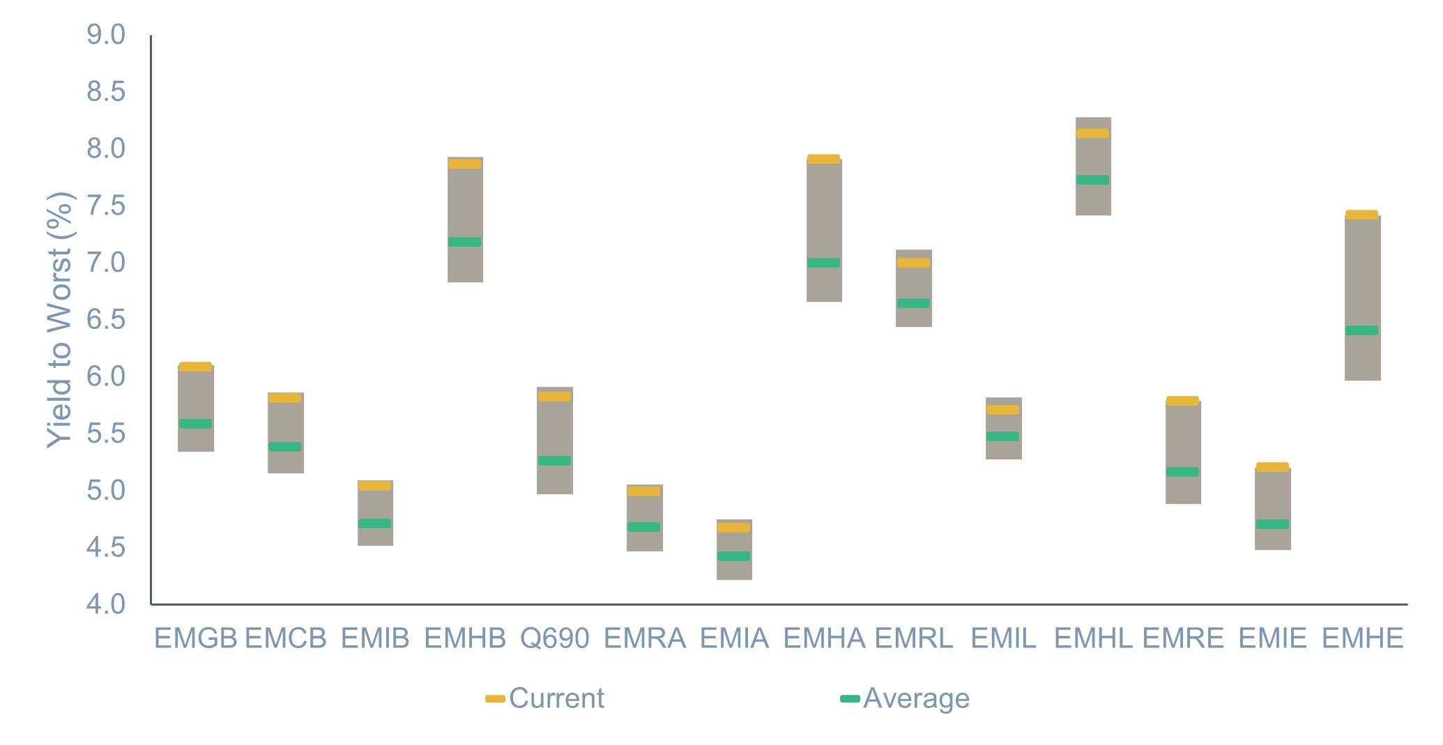 Source: ICE Index platform, as of 13th April 2026. ICE BofA Emerging Markets External Sovereign Index (EMGB), ICE BofA Emerging Markets Corporate Liquid Index (EMCL). For illustrative purposes only.