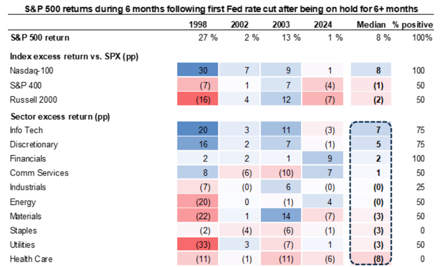 Source: Goldman Sachs Global Research, “Keep Buying Stocks When the Fed Cuts into a Growing Economy,” September 26, 2025. For illustrative purposes only.